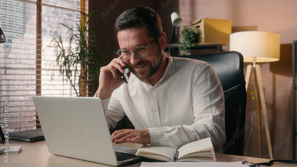 Smiling Caucasian man glad executive male guy agent talk mobile phone negotiation with client business in office worker salesman typing touchpad laptop paperwork manager ceo businessman planning work