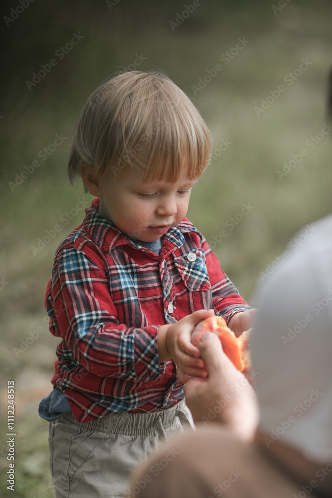 Man hands holding fresh and ripe picked Peach fruits, give it fruit his son. Peaches orchard