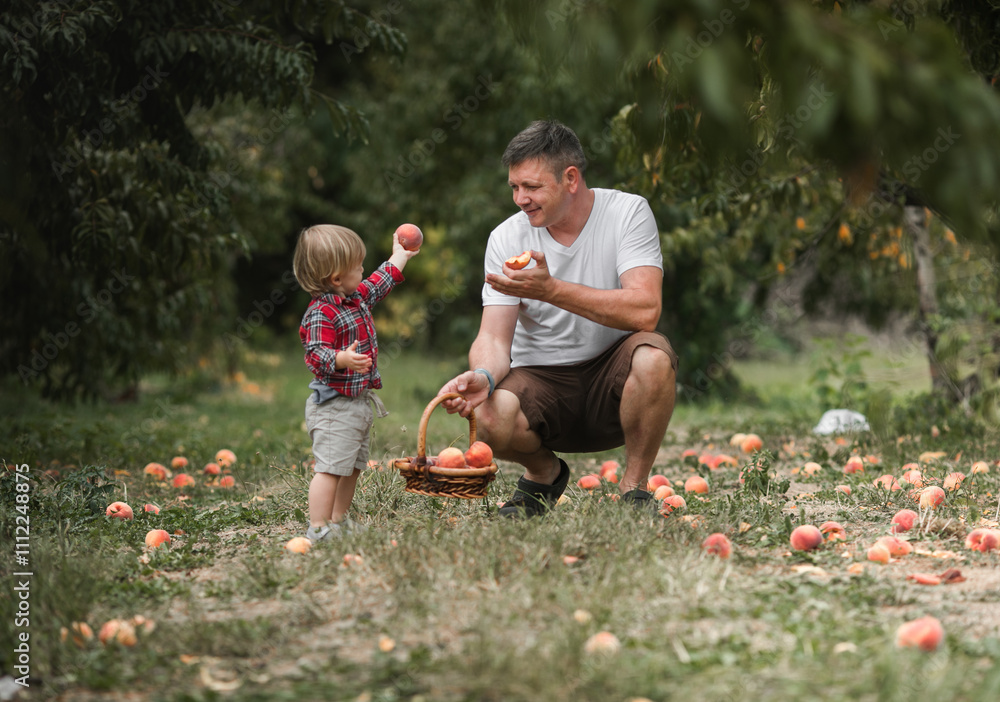 Man hands holding fresh and ripe picked Peach fruits, give it fruit his son. Peaches orchard