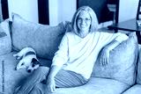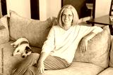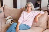Portrait happy healthy middle aged woman sitting on comfortable couch at home