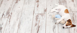 Small dog sleeping and embracing toy