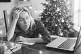 Sad middle aged woman working at the home office by laptop during Christmas holiday