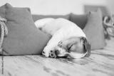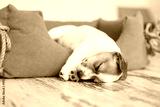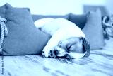 Small dog sleeping at home on the orange bed