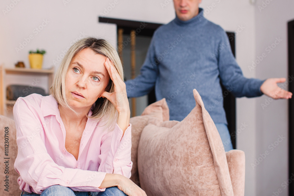 Angry middle aged couple arguing shouting blaming each other of problem