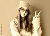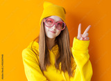 portrait of young pretty hipster woman wearing yellow hats and glasses.