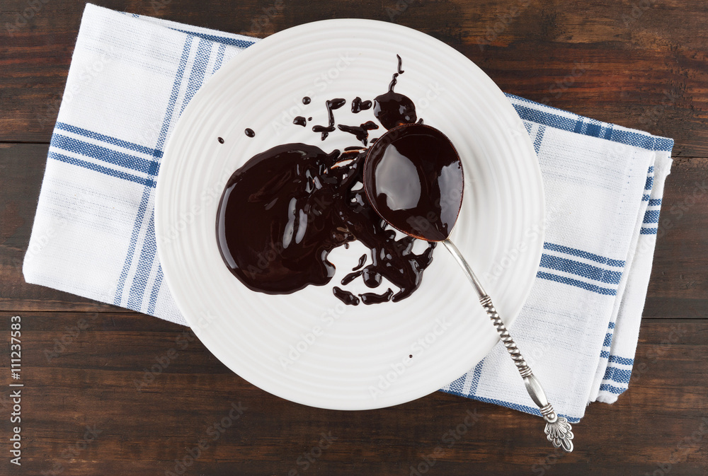 Vintage sliver spoon covered in melted chocolate on white plate and wooden table. Top view.