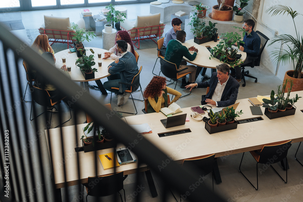 Coworkers collaborating and discussing projects in modern green office space