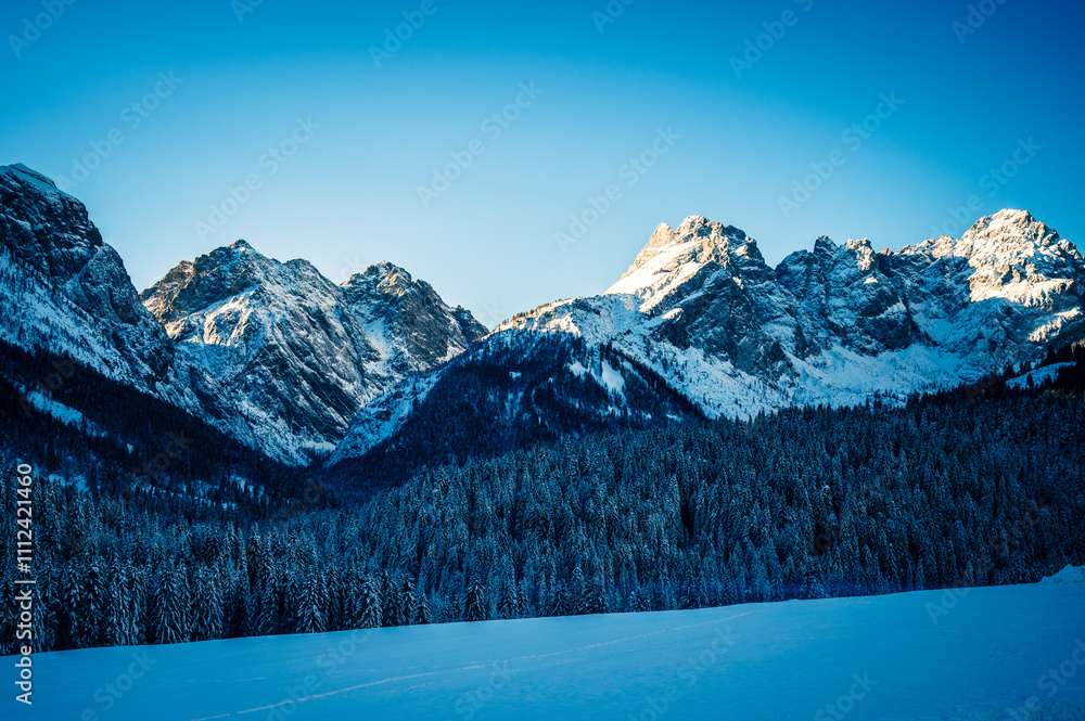 Ice Dawn in Sappada. Walk through ancient villages and dream mountains. Dolomites.
