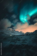 Northern lights illuminating snowy mountains in lofoten islands, norway