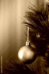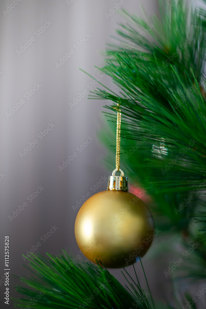 Close up view of fir branches with shiny gold ball Christmas holidays background. copy space. Decoration on christmas tree in Christmas Festive and Happy New Year