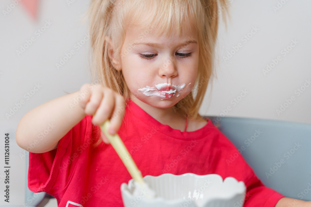 Little toddler girl child eats cottage cheese or yogurt with a dirty mouth at home sitting on a high chair.