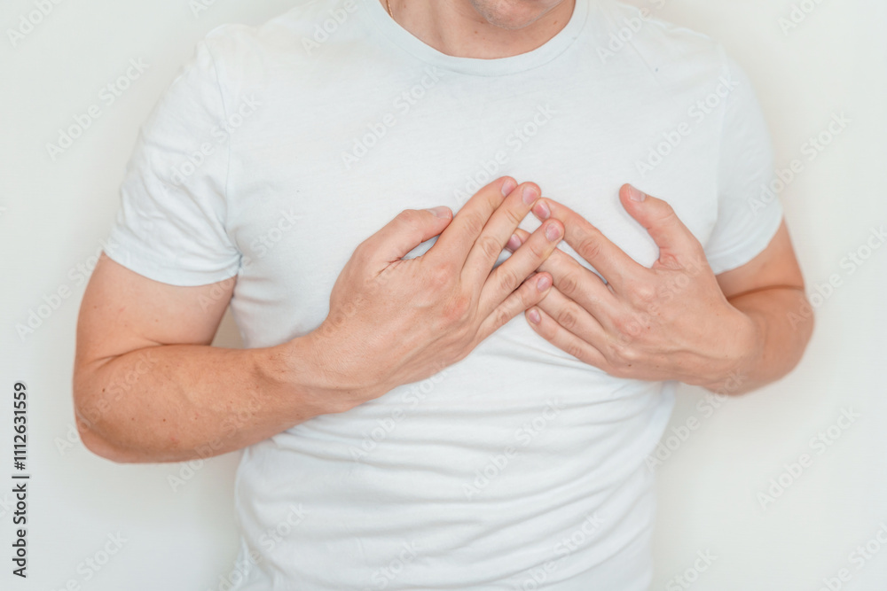 A man holding his chest, the concept of a sick heart. Man suffering from chest pain with painful expression