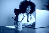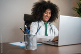 Young Black female doctor with a beautiful afro hairstyle is smiling as she types on her laptop in her office. She looks happy, confident, and focused on her work.