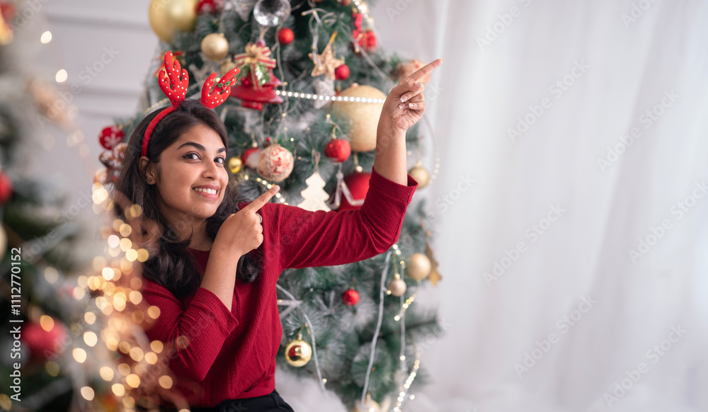 Happy young girl pointing upward, surrounded by Christmas decorations and glowing lights. Perfect for seasonal advertising, discounts