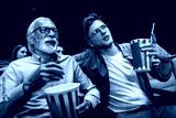 Grandfather watching movie in the cinema with his grandson. They eat popcorn and enjoy the movie.