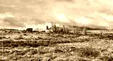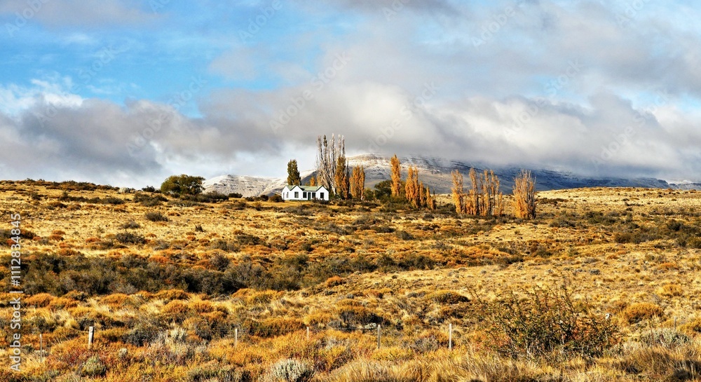 House in the pampas autumn landscape in southern Patagonia, Argentina.