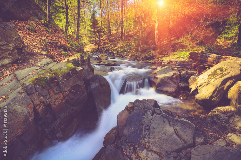 Beautiful waterfall and rapids on a mountains river in sunlight.