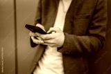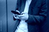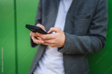 close up of young man use mobile phone in front green wall outdoor