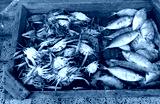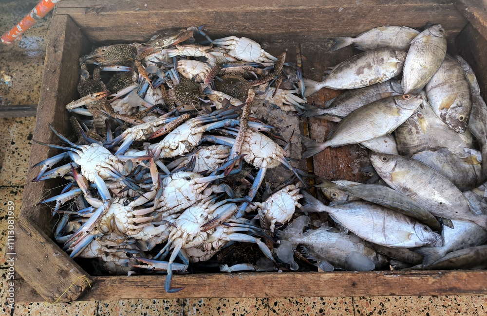 Fresh crabs in ice. Seafood at the market. Blue paws and claws. Day. Autumn. Egypt.utumn. Egypt.