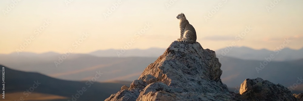 A solitary animal perched on a rocky outcrop against a scenic landscape at sunset.