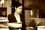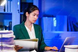 An Asian businesswoman works overtime,sitting at her desk at night, searching through numerous documents on her PC or laptop.Facing office problems,she also chats online while handling lots of work