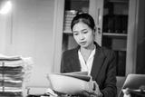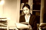 An Asian businesswoman works overtime,sitting at her desk at night, searching through numerous documents on her PC or laptop.Facing office problems,she also chats online while handling lots of work