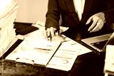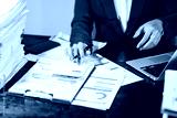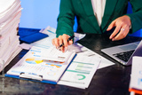 An Asian businesswoman works overtime,sitting at her desk at night, searching through numerous documents on her PC or laptop.Facing office problems,she also chats online while handling lots of work