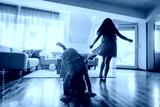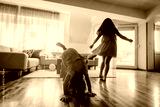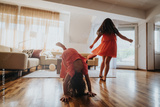 Two young girls in red dresses enjoy playful activities in a bright and cozy living room with wooden floors and natural light.