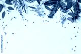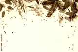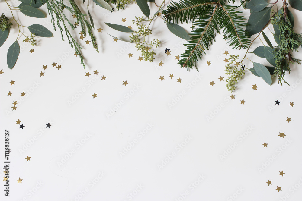 Christmas, New Year decorative frame. Festive web banner. Green garland of eucalyptus, fir, cypress tree leaves branches. Golden star shaped confetti isolated on white table background. Flat lay, top