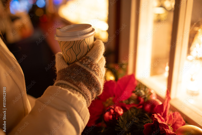 Unrecognizable woman's hand in winter gloves holding a generic take-away plastic coffee cup at a Christmas market in Europe. Close up shot, shallow depth of field, nighttime, decoration lights
