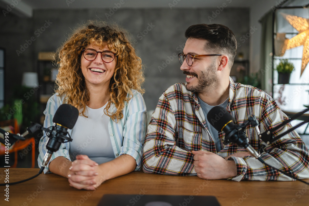 Portrait of two radio hosts laugh and enjoy while record podcast