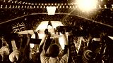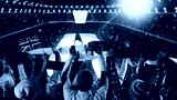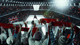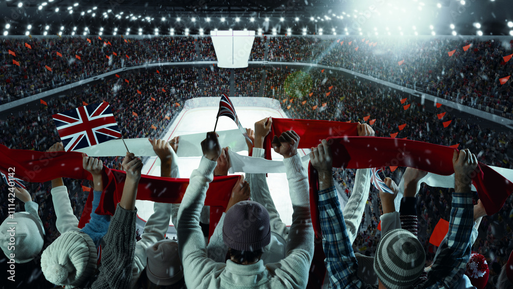 Panoramic view of packed stadium during winter sports game, with fans holding flags and scarves, creating supportive and festive atmosphere. Concept of sport, game, competition, emotions