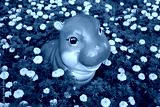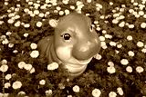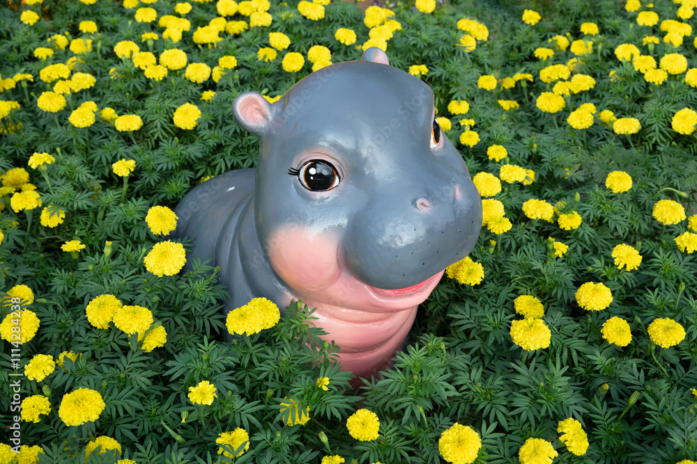 Dwarf Pygmy hippo statue in marigold flower field