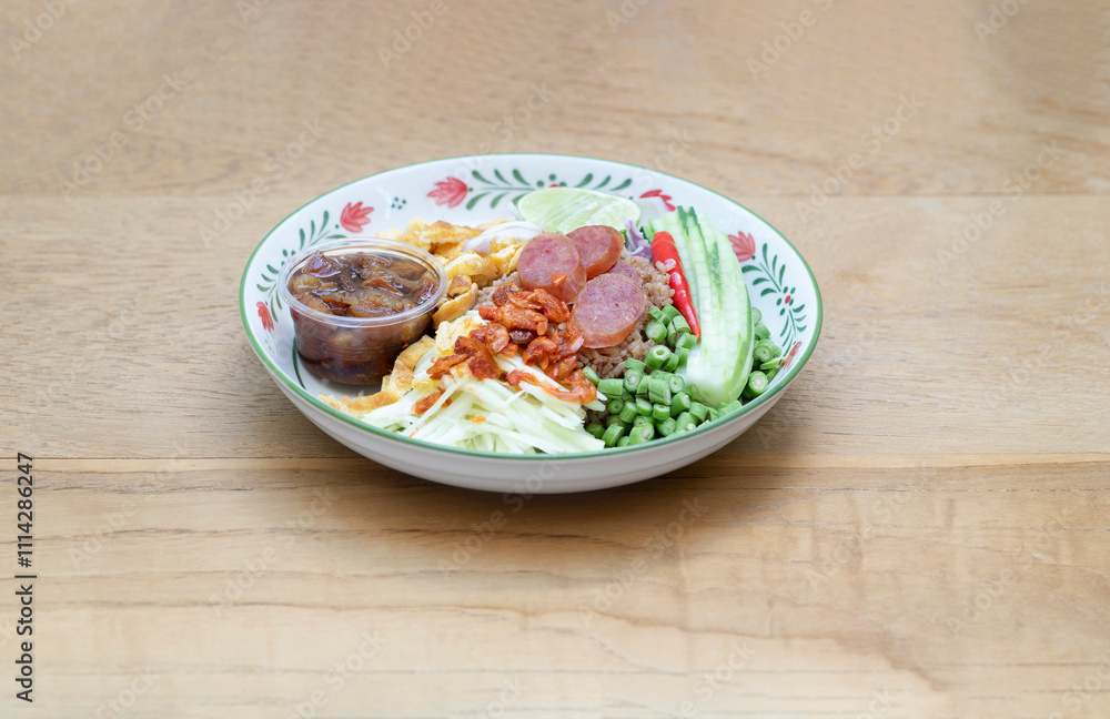 Shrimp paste fried rice or Khao kluk kapi on wooden table.
