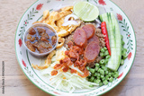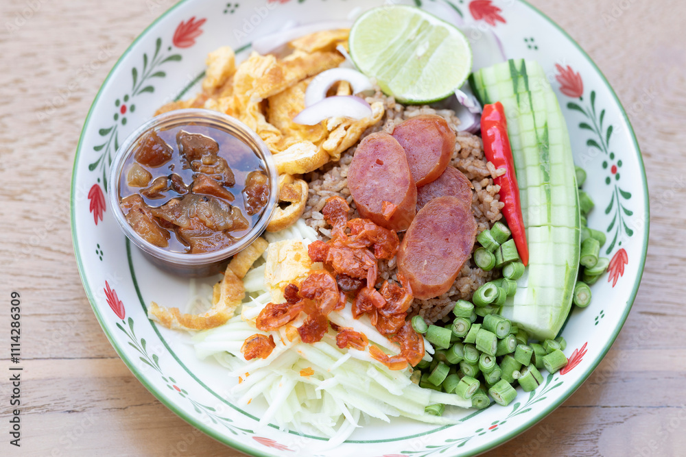 Shrimp paste fried rice or Khao kluk kapi on wooden table.