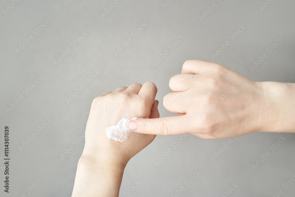 Young caucasian female applying skincare cream to hand for moisturizing and hydration against gray background.