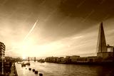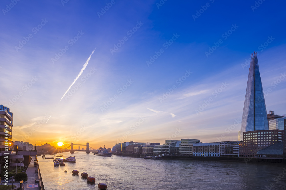 London, England - Tower Bridge and famous skyscraper at sunrise with blue sky