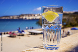 Glass of sparkling water with slice of lemon on the beach of Mellieha, Malta