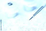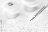 Close-up of paint by numbers canvas with brush and color pots on a soft focused background for creative diy art projects.