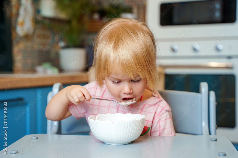 Little Caucasian child toddler girl eats chocolate balls with milk in the kitchen.