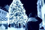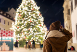 Woman standing and looking at illuminated Christmas tree. Happy New Year decorations at city fair. Concept of winter holidays, joy, festival