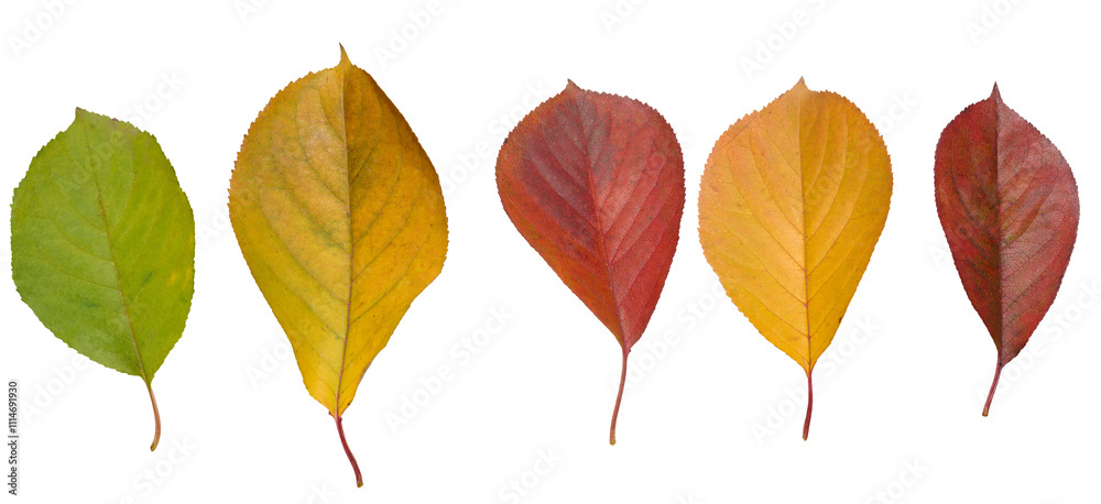 Green, yellow and red cherry tree leaves on isolated background, cyclicity of nature