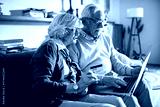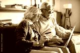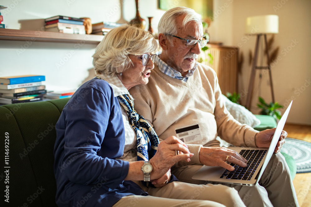 Happy senior couple online shopping with laptop on couch at home