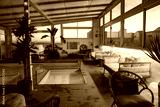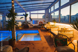 The indoor pool area features warm lighting, lush plants, wicker seating, and Moroccan elements. Large windows offer a sunset view, enhancing tranquility.