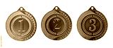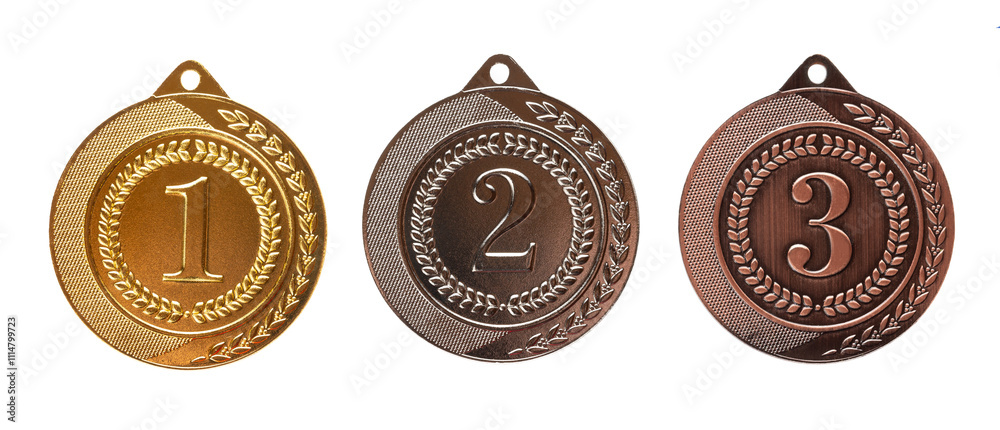 Three medals gold, silver and bronze isolated on white background. Reward for 1, 2 and 3 place in sports or competition