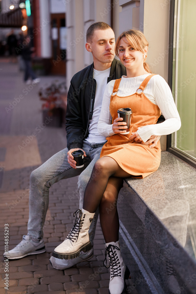 Romantic Evening Stroll: A Young Couple Enjoys Coffee in Cozy Urban Setting