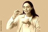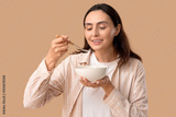 Young woman eating tasty soup on beige background