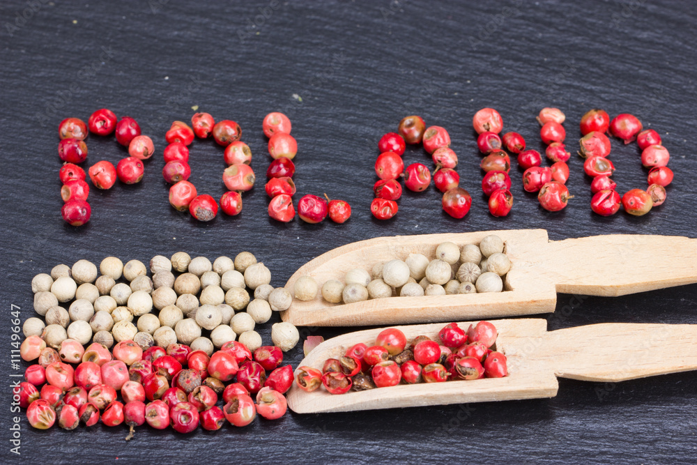 Inscription "Poland" made of grains of pepper