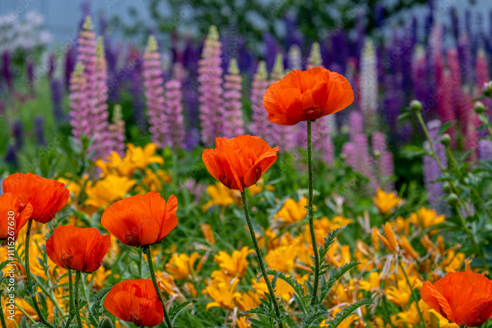 Red blooming poppies in a field close-up.