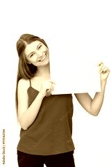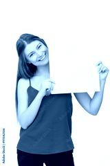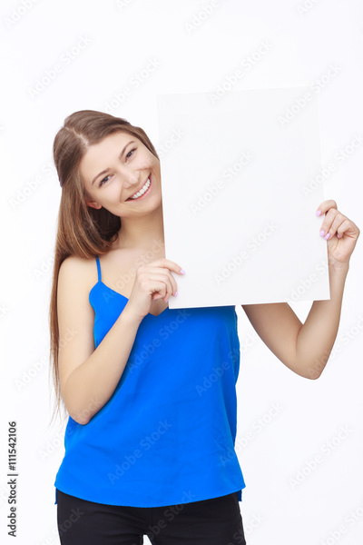 happy woman holding white blank paper
